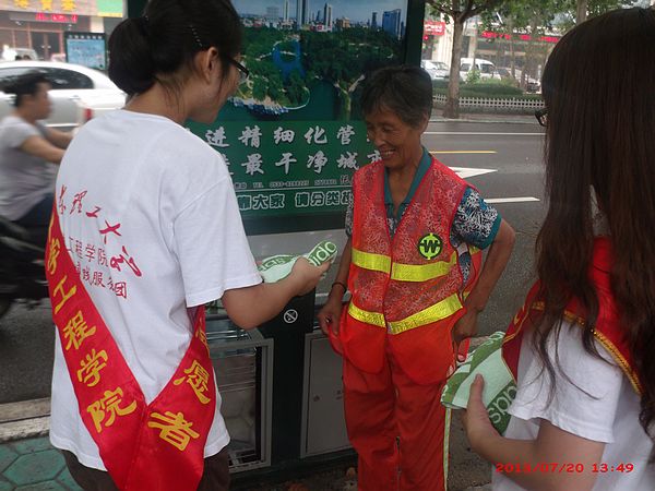 上午10时,实践队到达大润发超市,进行感恩活动的宣传。队员们活动展板上张贴体验环卫工人工作的照片,并将活动条幅悬挂好,以便路过顾客进行签名感恩。实践队随后进行了“炎热天气 为环卫工人送毛巾”的感恩活动,以表达对“城市美容师”的感激和敬佩之情。烈日炎炎下,实践队员将一条条毛巾送到辛勤劳动的环卫工人手中,同时也将一颗颗感恩的心传递在城市的道路中间。临近中午,一名环卫阿姨当得知实践队员仍然没有吃饭的时候,热情的将自带的干粮递给队员,并关切的说:“真是太感谢你们了,这么热的天气还在为我们送毛巾,都中午了还没吃饭,我来给你们送吃的。”婉言谢绝了阿姨的好意后,队员们坚持将最后一条毛巾送至环卫工人手中才返回学校。