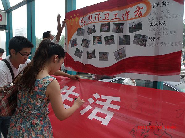 继体验环卫工人工作后,7月20日,我院社会实践团队“盛夏日记”在淄博市大润发超市门口进行“感恩环卫工人”活动,实践团全体队员参加活动。