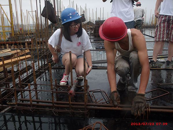 早上6点,实践队集合我校东门,一起前往天齐置业进行实践。按照事先的协商,企业负责人热情的带领实践队进行参观考察。负责人为每个队员配备了一顶安全帽,一切安全措施完成后,实践队跟从负责人进入工地,负责人一面向大家讲解楼房建筑的基本情况,一方面从专业的角度解说施工材料的合理性、可实施性,并强调材料选择不当会给施工带来多大的安全隐患。当负责人将大家引领到楼层最高处时,此时下起了蒙蒙细雨,道路变得格外滑,稍有不慎就可能跌倒。而建筑工人们却没有任何的懈怠,依旧风雨无阻的坚持施工。实践队了解到,工人们大多来自外省,只有过年的时候才有机会回家,一家人团圆的机会更是少的可怜。借此机会,实践队与负责人协商参观下工人的宿舍。宿舍中,一张张稚嫩的面颊首先映入大家眼帘。据负责人介绍到,这些都是外来务工人员的子女,趁暑假时间与相隔千里的亲人团聚。当看到一名小女孩在冒雨洗衣服时,队长冯慧上前与其交流,当问起是否想爸爸妈妈时,孩子羞涩的对冯慧说,“想,天天都在想。”