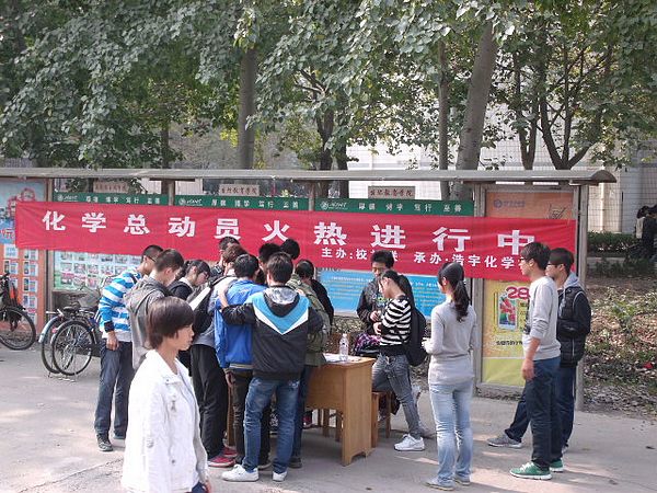 此次“化学总动员”活动以趣味性化学学习为主,旨在提高同学们学习化学的兴趣,提高化学素养。据了解,整个活动由“元素抱抱”、“元素卧底”、“化学谜语”三部分组成,以一种别开生面的活动形式将化学结合融入到之中,巧妙的将趣味性与学术性相结合。活动中,化学将会被重新定义,以化学的名义开启一场全新的化学之旅,带领参赛者玩转化学世界。活动报名现场人头攒动,现场气氛热烈。该社团成员耐心为上前咨询的同学解疑答惑,并帮助感兴趣的同学报名。
