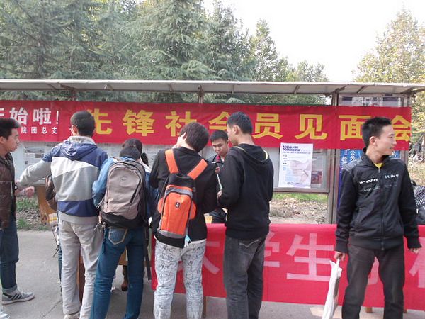 10月25日中午,我院先锋社在西校区第二餐厅门口开展纳新活动。该社团部长、副部长及干事参加了活动。