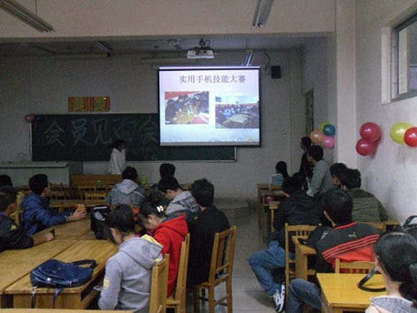 活动伊始,主讲人首先向大家介绍了该社团的发展历程、社团的宗旨、性质以及各种品牌活动,并向会员简介本学期将要举办的几个活动。随后,由该社团副部长、技术部骨干孙延棚为大家介绍关手机系统、硬件、软件三个主要方面的基础知识。他强调安卓系统是目前手机应用最广泛的系统,并围绕安卓系统的刷机问题进行了详细的讲解。接着,他播放了为大家精心准备的“节奏大师”视频,其中游戏者高超的技艺让大家叹为观止,跃跃欲试;然后,他开始介绍安卓系统各种处理器的优势与所欠缺的地方。在讲到电子市场信息量之大时,他说“这使得我们在购买电子产品时有较大的选择空间,但同时大家也会感慨电子产品更新换代速度之快,感觉自己跟不上时代的步伐”。接下来是抢答环节,主讲人会对抢答正确的同学赠送的精美小礼品,以促使大家踊跃答题,这将此次会员见面会推向了高潮。活动最后,由社团工作人员统一发放会员证予以证明。