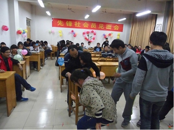 活动伊始,主持人向到场会员进行精美的PPT展示,以动态、唯美的方式给大家介绍了先锋社以及社团主要成员,并展示了各类活动照片,简单直观地呈现了活动内容与形式。“先锋社是一个社会公益性社团,而社会公益的本质就是要为社会、为大家服务。”张浩这样说道。讲解过后,接下来的游戏环节立刻带动了现场的活跃气氛:在“我来比划你来猜”游戏中,由每组选出两位同学搭档考验默契,表演的同学使出浑身解数进行模仿,甚至不惜“自毁形象”,引的现场同学连连拍手叫好。而第二个“合力吹气球”游戏更是在同学们争分夺秒的比赛中将活动推向了高潮。活动最后,该社团给大家赠送小礼品作为纪念。