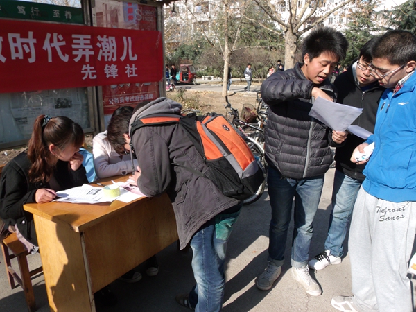 为此先锋社为同学们提供了一个学习、展示的机会。活动主要包括通过PPT播放有关十八大的视频、关于十八届三中全会的知识竞答以及随机抽题回答三个环节。在宣传现场,同学们热情高涨,踊跃报名,充分体现了当代青年的社会责任感。此外,有意向的同学还可以通过编辑:通过短信形式报名参加。