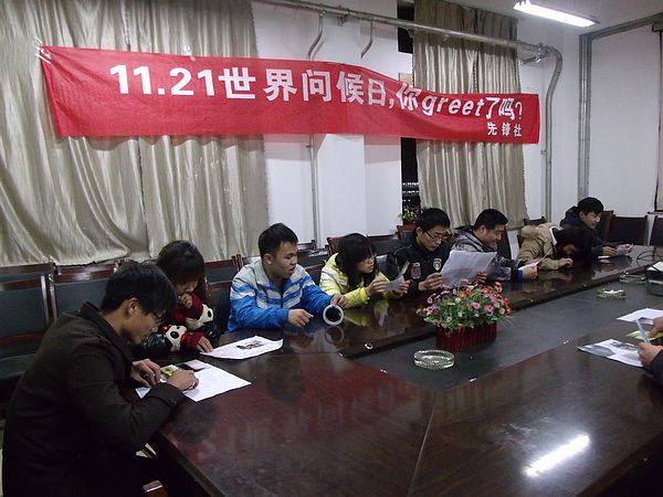 送出一声问候,添暖人间天堂。 11月2日晚,我院先锋社在我校13号教学楼546会议室进行“世界问候日 你greet了吗”照片评选活动。我院社团联合会各社团会长参加评选活动。