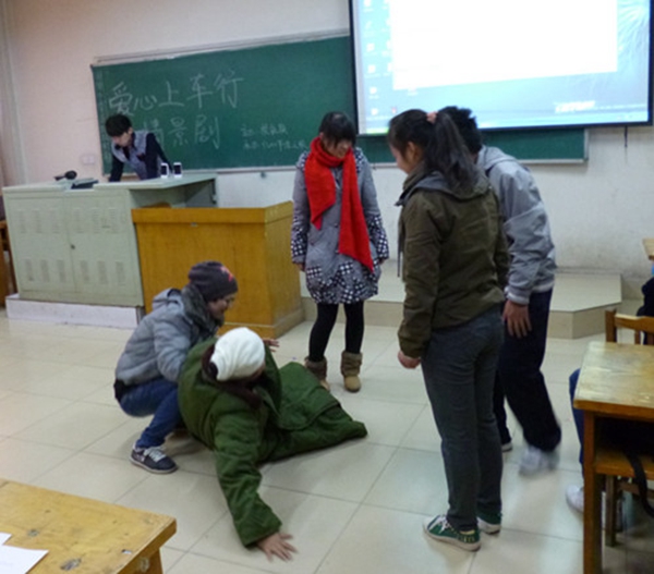 为保证活动的公正公平公开性,此次活动顺序由抽签决定,另外,该社团不允许其骨干成员参加比赛。参赛选手表演的情景剧丰富多彩,从老人跌倒到媒体炒作,从餐桌文明到光盘行动,每支队伍都体现了自己的特色和优势。其中,《扶起的是什么》以老人摔倒为主线,把针对摔倒老人现象路人的无情观望、老人无助的眼神、媒体的冷漠等社会现象都融入到表演之中。这引起了同学们深刻的反思,也鼓励同学们伸出自己的援手,为美好社会贡献自己的力量。另外名为《二代们的聚餐》的情景剧也很吸引人。情节被安排在餐馆里,通过富二代、穷二代、农二代的不同表现,反射出现实社会中人们对餐桌文明的忽视,倡导大家落实光盘行动,文明就餐。演员的精彩表演换来观众的阵阵掌声。