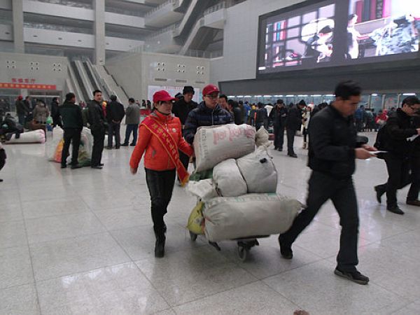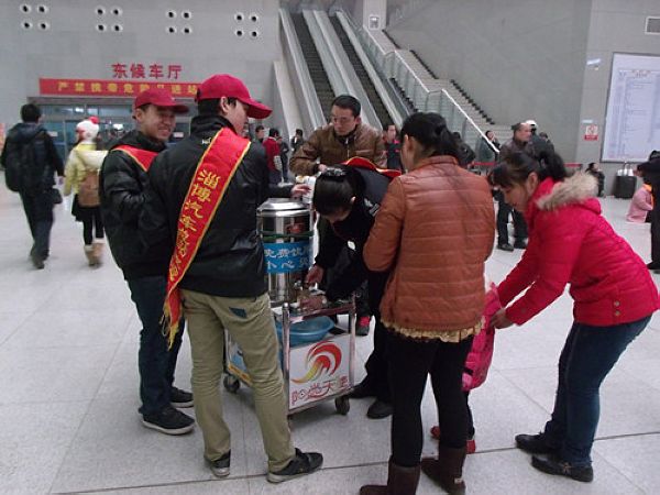 今早虽然大雾弥漫、寒风凛冽,但同学们助人为乐的热情不减。到达客运中心后,经车站工作人员讲解注意事项和分配活动任务,志愿者分成三组:流动提供热水服务,候车厅检票并安抚因大雾滞留乘客的焦急情绪、维持售票口秩序,帮忙乘客运送行李。大雾使得大量车次晚点,不少乘客都情绪急躁,加之买票队伍冗长,不少乘客不愿排队候车,同学们上前一一进行说明劝导,令其按序排队。运送行李的同学们面对行李较多的乘客主动上前伸出援手,帮忙他们把行李从售票大厅送到候车室。志愿者推着满满的行李车,与乘客交流着,尽管天气寒冷,但他们头上却冒出了汗珠。卸下行李,乘客暖暖的道一句“辛苦了,谢谢”。“有需要热水的吗?”这句简单的话不知被说了多少次,志愿者推着盛有热水的车子,与车站相关工作人员一起,把温暖送到每个乘客手中。乘客时间在志愿者的忙碌中流逝,中午12点钟大部分乘客顺利出站,此次活动也随之结束。