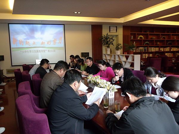 为更好地发挥大学生发展指导室“以生为本,因材施教”的工作理念,提高服务质量,4月10日下午,“大学生发展指导室”第101期在大学生发展指导中心106室举行。我校教务处副处长赵增典、学生工作处副处长王玉冰、我院党总支副书记董云会、李冰强、学生科各位老师、“大学生发展指导中心”骨干及学生代表参加。会议由学生科科长廖君华老师主持。
