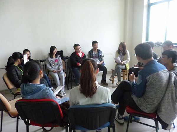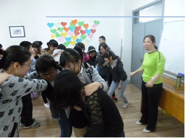 在《相逢是首歌》的美妙旋律中,活动开始进行。在主持人的带领下,首先进行了“一块五”的游戏,男生“五毛”,女生“一块”,对于主持人提出的“价格”所有成员你争我抢,积极凑数,笑声不断,参与成员渐渐进入活动状态;随后,“蜈蚣翻身”的游戏很快将活动推向高潮,“无敌二队”和“天狼队”两队队员齐心协力,密切配合,不断总结经验,进行了激烈的竞争,最终“无敌二队”以一分险胜;之后的“进化五部曲”活动,“蛋、鸡、鸟、猴、人”五级进化,同级间以剪子、包袱、锤的形式决定进化程度,有的一不小心变为“蛋”,有的很顺利的进化成“人”,给同学们带来无尽的遐想。最后,活动在同学和主持人老师的总结和升华中结束,每个参与者都意犹未尽。