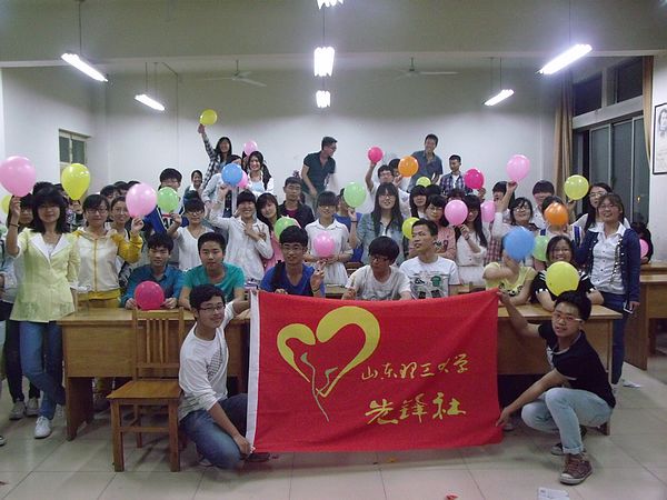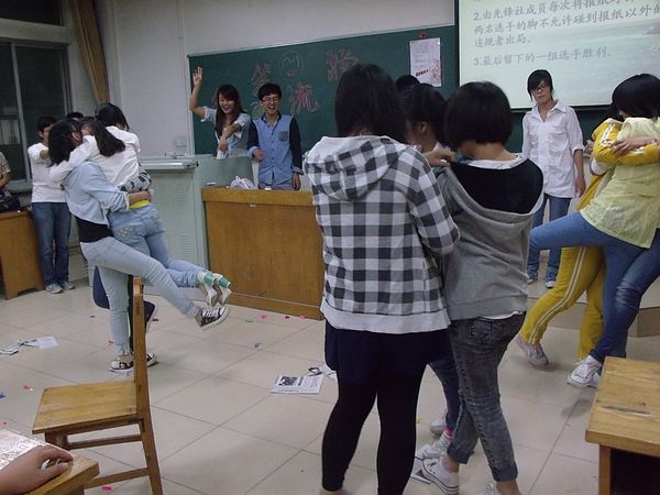 活动由几张可爱的动物笑脸和一些暖人的微笑语录拉开序幕。为了让大家玩得高兴,笑得放肆,先锋社精心准备了“微笑游戏乐翻天”的游戏互动。在“额头禁止令”环节中,参赛选手不仅要绞尽脑汁让对手说出或做出贴在额头处字条上的内容,又要时时提防对手所设的陷阱。选手们各展其能,妙语连珠,引得大家阵阵欢笑。“折报纸”环节更是令人捧腹不止,由先锋社成员每次将报纸对折,报纸上的三名选手不得将脚触碰报纸以外的地面,违规者淘汰出局。随着报纸面积越来越小,选手们或踮起脚尖,或抱成一团,造型夸张,奇特搞笑。最后,与会人员在气球上画上笑脸,签名留念。活动在一片欢声笑语中结束。