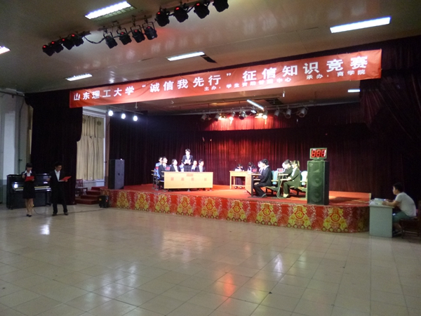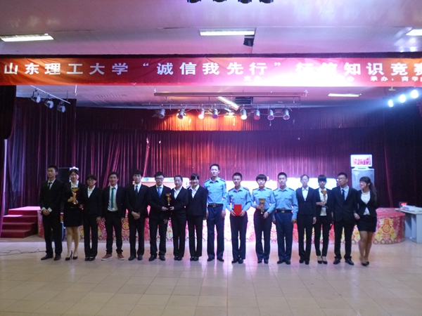 创建征信知识平台,树立良好诚信意识,5月20日晚,由学生资助管理中心主办、商学院承办的山东理工大学“诚信我先行”征信知识大赛决赛在我校东校区大学生活动中心举行。我院与来自商学院、国防教育学院的其他三支队伍展开比拼,经过激烈角逐,最终获得三等奖。