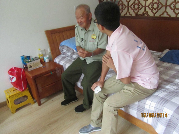 2014年8月18日我院红色寻迹实践团队队员们来到了八一敬老院,采访当年和毛泽东一起打天下的老红军,了解他们平时的生活和娱乐情况,早上九点十分,队员们和延安日报的记者来到八一敬老院,张书记热情地接待了我们,并向我们介绍了当年留下的老红军刘泽民等老爷爷们。