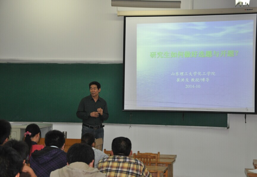 10月10日晚7:00,化学工程学院在13号教学楼403教室召开了研究生如何选题和开题的专题讲座。崔洪友教授为此次讲座的主讲人,赵义老师担任此次讲座的主持,2013和2014级硕士研究生聆听了此次讲座.崔洪友教授围绕如何做科研、如何阅读文献、选题和开题等方面进行了详细、生动和深入的讲解。同时提出了几点希望:第一,希望同学们培养好良好的科研习惯;第二,处理好与导师的关系;第三,要脚踏实地的做科研。此次讲座内容丰富多彩,语言生动幽默且具有哲理,同学们均感到受益匪浅。本次讲座为同学们如何做科研和大家的前途指明了方向。整个讲座在同学们的热烈掌声中结束了,一定会牢记崔教授的谆谆教导。