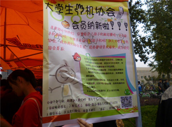 为了早点布置好纳新场地,社团成员提前到达指定地点贴好条幅和宣传海报,这次纳新与以往不同的是按照学校社团联合会的标准采用了简单环保的方案,不使用单页进行宣传,减少了会场垃圾,节约了资源。另外纳新活动不再与校外商家合作进行商业宣传。手机协会此次纳新除合理利用条幅和海报进行宣传外,还使用了有趣的漫画来吸引更多的会员,会员的福利也有了增多:手机协会会员每个学期可以有两次免费手机贴膜的机会,日常生活中遇到手机问题也可以找社团免费解决,社团提供免费的刷机服务等。这些福利确实吸引了不少人前来报名。