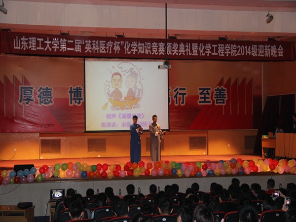 10月25日晚,我校第二届“英科医疗杯”化学知识竞赛颁奖典礼暨化学工程学院2014级迎新晚会在3号报告厅隆重举行。淄博英科医疗制品有限公司董事长助理唐烨、生产经理李鹏、品质经理杨志文、校团委副书记刘晓东、我院党总支副书记董云会、李冰强及其他部分老师与学院14级新生一同观看晚会。