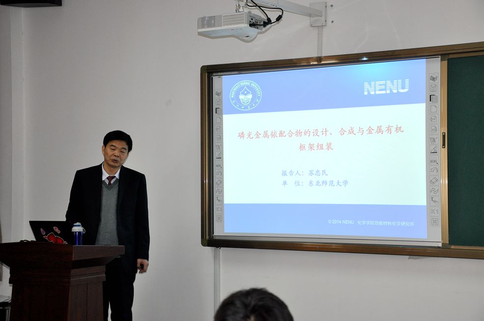 首先,苏忠民教授做了《磷光金属铱配合物的设计、合成与金属有机框架组装》学术报告,从理论计算到与实验结合深入浅出的讲解了此类化合物的一些光电性质。接下来,禚淑萍院为苏忠民教授介绍了化学工程学院的基本情况,欢迎苏忠民教授作为我院的兼职教授,希望他能为学院的发展多做贡献。苏忠民教授表示会做好本职工作,为学院的发展和教师的发展尽自己的全力。