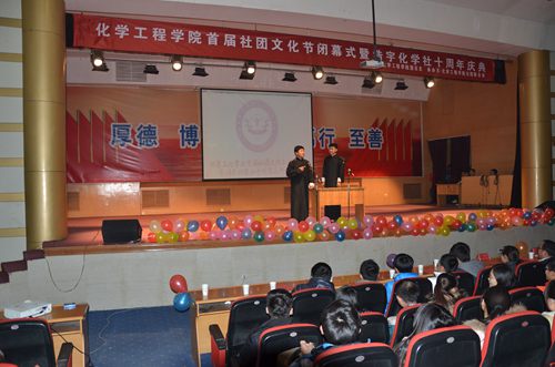 为展现社团风采,进一步丰富学院社团文化,12月14日晚,由我院社团联合会承办的“化学工程学院首届社团文化节闭幕式暨浩宇化学社十周年庆典”在3号教学楼报告厅成功举办。校团委副书记刘晓东,学院党委副书记董云会,学院团总支书记廖君华,辅导员亓鹏、郭洪涛、孙明等与同学们一同观看晚会。