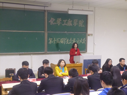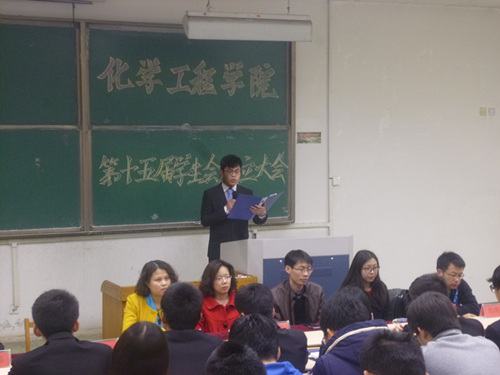 大会首先由十四届学生会主席李野对十四届学生会工作作了总结报告。他提出,化学工程学院学生会在学院领导、老师的支持帮助下得到长足发展,无论是在课余活动的组织还是学习氛围的创造方面都起到了至关重要的作用。在十四届学生会的带领下,化学工程学院各项工作都开展的十分顺利,在各类竞赛中取得了优异成绩。但荣誉终归是过去的,他希望十五届学生会能扛起大旗,收获更加丰硕的成果。紧接着,十五届学生会主席宋磊对未来的工作做了展望,他提出学生会的工作计划,并许下了庄严的承诺。