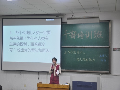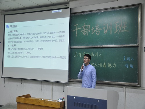 为提升我院学生干部的领导力和人际交往沟通能力, 11月18日晚,我院在4号教学楼105教室举行学生干部工作技能培训大会。此次会议由我院校学生会常务委员杜道光、原社联主席徐丽担任主讲人,全体培训班成员参加会议。