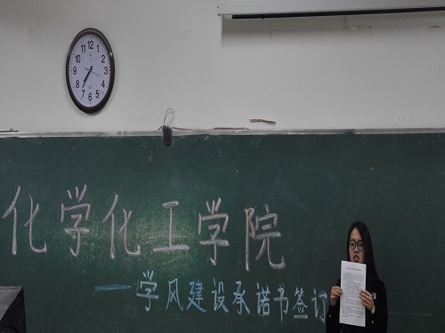 为全面贯彻我校“一精神”、“一规划”专题精神,进一步推进本科教育优质工程从而实现我校建设教学研究型大学目标。根据学校工作部署及要求,我院决定实施“师生联动、全员育人”学风建设方案,目的在于发挥教师的主导作用和学生的主体作用,着力解决当前学风建设中的突出问题,建立长效机制,推进学风建设常态化。11月21日晚,我院全体大一学生在辅导员王菲的带领在5号教学楼101教室签订《化学化工学院学风建设承诺书》。