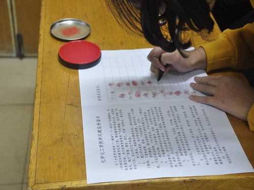 签订仪式伊始,王菲向同学们宣读承诺书内容。王菲从关心集体、爱护教室、合理使用互联网等与大学生活密切相关的方面详细阐述学风建设的重要作用。她表示良好的学风对于同学们以后的学习和生活有很大帮助。王菲语重心长地说到作为当代大学生,同学们应该从小事做起,遵守学校的规章制度,为学院以及学校的学风建设贡献自己的力量。学生干部更应该发挥带头作用,带领本班同学建设学风优良班级。随后,各班学生代表依次上台对学风建设表态。“学风建设应该从我们每一个人做起,由小做大才能使良好学风深入每一位同学的内心。”一位学生代表在台上激昂地说道。发言完毕后,各班级学生依次在承诺书上签字按手印。会后,王菲要求同学们用实际行动将我院建设成学风优良的学院。
