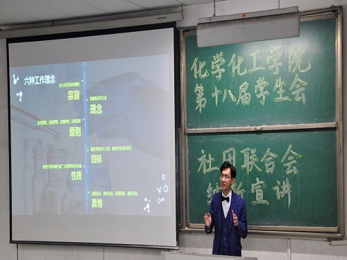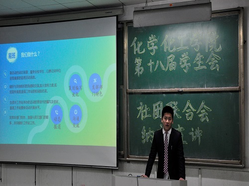 为吸纳更多优秀的人才,给学生会注入新鲜血液,3月28日晚,我院在5号教学楼101、103教室召开化学化工学院第十八届学生会纳新宣讲会,参加此次宣讲会有我院主席团成员,各部门部长及大一全体学生。
