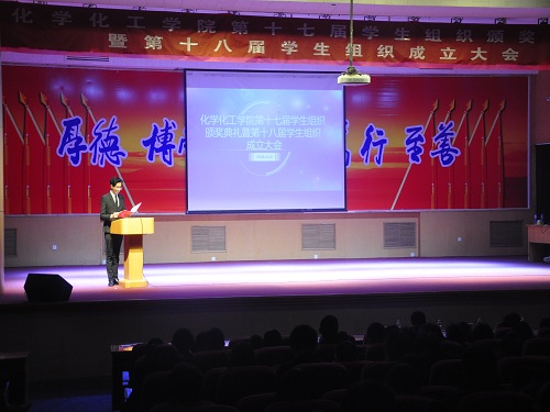 全员坐定,主持人宣布大会正式开始。首先,17届学生会主席卢峰以幽默风趣却又不失严谨认真的态度对新一届学生会表示衷心祝愿。随后,他真诚地向大家分享在学生会工作的经验和心得,并告诫大家“不忘初心,方得始终”。随后,17届社团联合会主席巴迪迪介绍了社团联合会一年的工作情况与日后发展方向,并感谢领导老师、同学对她的帮助。伴随着掌声,曹晓媛上台宣读第十七届学生会部长级以上成员名单,并和赵佳佳、类延东、王菲几位老师为他们颁发荣誉证书。随后,曹晓媛宣读第十八届学生会部长级以上成员,几位老师为他们颁发聘书。颁奖环节结束后,18届学生会主席赵嘉辉上台演讲,他首先对帮助过自己的老师和同学们表示衷心感谢。他表示今后将以实际行动承担责任,并向大家表达自己的决心和设想——发扬化院精神,调整工作结构,完善制度体系,加强自身建设,切实服务同学等。随后,社联主席徐超凡向大家汇报社联以后的工作计划。最后,曹晓媛上台作总结发言。她表达对于17届学生会不舍的同时也表达了对新一届学生会的美好期望。