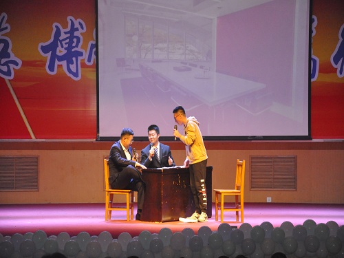 典礼伊始,震耳欲聋。由一诺威公司带来的《开场鼓》气势恢宏,大气磅礴。热情的鼓声点燃现场的激情,拉开了典礼的序幕。青春昂扬的舞蹈串烧使观众目不暇接,带给观众们一场视觉盛宴,展示了同学们的青春与活力。相声《游戏成瘾》内容贴合实际,警醒同学们沉迷游戏的危害。杂技《古枫竹鸣》和舞蹈《烟雨如画》将现代歌曲与古风艺术结合,展现了中国传统文化风采。杂技《超级篮球》给观众展示了不一样的篮球风采,炫酷的动作令观众眼花缭乱。朗诵节目《青春的征程》和《遇见》,以大学生活为主题,充满青春的气息,令在场观众们身临其境,充满感触。歌曲《爱一点》充满浪漫、恋爱的味道,《马车桥是个好地方》展示了金诚石化集团的年轻活力,博得观众满堂喝彩。小品《超级招聘会》,相声《学表演》赢得观众满堂喝彩,笑声不断。