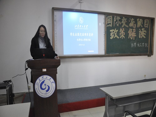 为使同学了解学校出国项目,方便同学们进一步发展,11月22日下午,化学化工学院在13号教学楼404会议室举行国际交流项目政策解读会,国际合作与交流处蒋晓倩进行项目解读,学院部分18级同学参加会议。