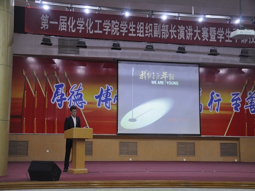 会议伊始,化学化工学院主席赵嘉辉对此次活动目的进行简要的介绍。随后,在主持人慷慨激昂的主持词中,此次活动拉开序幕。来自我院的各个专业的38名副部长,分别从国家科技发展,人生品格培养,心里素质提升等几个方面展开演讲。他们或以自己的亲身经历,或引用经典实例,优美的声音,激昂的语调,流畅的幻灯片,适时的背景音乐,把现场气氛一次又一次的推向高潮,在场的观众和评委共享着这一视听盛宴,在享受中收获成长的真正意义。此外,此次演讲比赛每人时长为三分钟半,超过三分钟有提示,比赛由评委现场打分,去掉最高分与最低分,取平均分,选手演讲结束后,由计分人员统计选手得分,在此轮选手演讲结束后公布。这在保证公平的前提下,又增加了比赛的趣味性,为在场的观众在收获感悟的同时,设置了悬念。最后,比赛在掌声中落下帷幕。