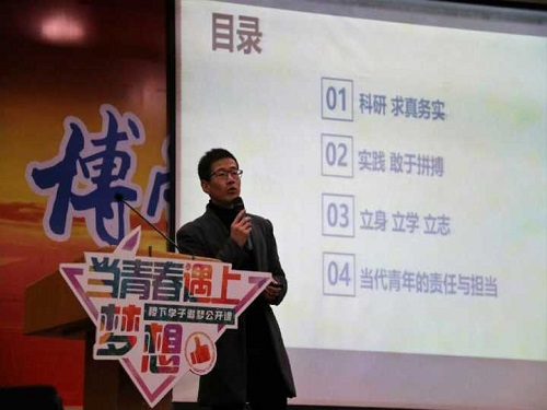 为引导同学们更好的正视青春、把握青春,践行梦想、实现梦想。12月17日晚,化学化工学院在三号报告厅举行“当青春遇上梦想”稷下学子追梦公开课活动。学院邀请到获得国家、省市、校级奖30余项,负责主持6个项目并受邀参展国际创意产业文化博览会的中国科学技术大学研究生杜进祥分享追梦历程。学院党支副书记李冰强致辞,学院辅导员侯振中、王菲、张永与学校400余名同学参加此次公开课。