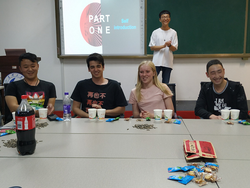 活动开始前,工作人员提前布置场地,摆放桌椅,发放零食,以便参与同学可以在轻松愉快的氛围中聊天。活动伊始,主持人上台做自我介绍,并说明此次活动的唯一要求——所有交流只能用英语进行。紧接着,第一个环节是自我介绍,一开始大家都略有羞涩,不敢轻易张口。在主持人的鼓励下,俄罗斯留学生Lanni第一个进行自我介绍。Lanni介绍到他来自美丽的俄罗斯,平时喜欢看书、旅行,他很喜欢中国。稍后同学们也慢慢放开自我,不再拘束,积极向其他同学介绍自己。
