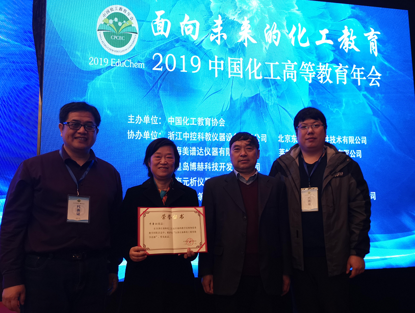 2019年中国化工学会开展了“全国石油和化工学者教学名师和优秀教学团队”的认定工作,经院校推荐,中国化工教育协会高校工作委员会、职业技术教育工作委员会初审,专家委员会评审以及公示等程序,产生“全国石油和化工教育教学名师”146名(本科院校54名、职业院校92名),“全国石油和化工教育优秀教学团队”100个(本科院校42个,职业院校48个),我院于鲁汕老师师被评为“全国石油和化工教育教学名师”,年会举行了颁奖仪式。仪式结束后我院教师与郝长江会长合影留念。