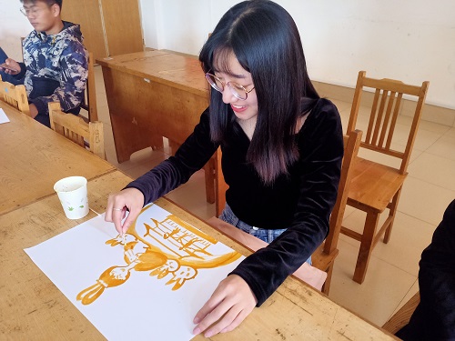 第二环节——化学喷图,用趣味化学实验的方式表达对自身对于祖国的敬意。参赛者两人为一组。活动负责人为参赛者准备纸张、彩笔、棉棒、纸杯、三氯化铁溶液、氢氧化钠溶液和酚酞试剂等所需材料。绘画时长为50分钟,待白纸干燥后用装有酚酞或者三氯化铁的喷雾器进行显色。绘制过程中参赛者以“庆国庆,迎中秋”为主题,根据自己的创意,充分利用化学试剂、化学反应来完成本环节。活动过程中同学们积极参与,集思广益,充分利用显色试剂进行绘画。部分同学利用氯化铁溶液绘制出嫦娥、月兔、月饼、月亮、天安门等创意图画,部分同学利用氢氧化钠与酚酞的显色反应绘制出人们欢度“双节”的写实场景。活动过程中,马金悦和谢丽颖负责活动拍照,辛超杰和刘亚辉维持现场秩序,同学们相互交流学习,展现出浓厚的兴趣。规定时间结束后,同学们按照排序依次站在讲台上介绍自己的作品,他们用灿烂的笑容、丰富的肢体语言声情并茂的介绍自己的作品,阐述自己的创作灵感与创作过程,表达自身对于祖国的热爱。在这个独特的假期,国庆节与中秋节巧合的重合,但因疫情原因,同学们未能回家与家人共度双节。本环节本着公平公正的原则,采取小组互评制与工作人员评价得出最终成绩。