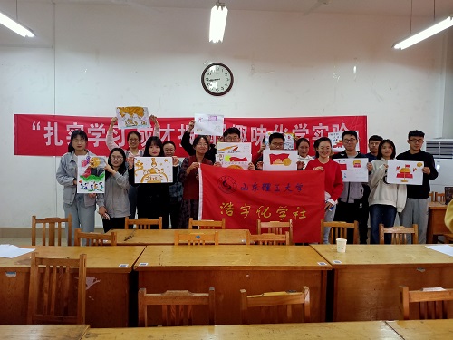 活动最后,全体人员在教室里手持作品与社旗留下美好的瞬间。并有部分同学们也向相关工作人员表达参与此次活动的真切感受,认为此次活动具有创造性与趣味性,在了解化学知识的同时,可以利用所学知识以实践的方式表达对祖国的爱意。