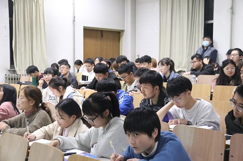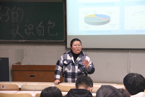 高佳琪根据小说《大江大河》中的两位角色为同学们分析相同的专业如何书写不同的命运,从中提取出职业生涯的核心观念——自我认知和职业要求。她引导同学们进行正确的自我认知,并从企业求职、升学深造、考公考编三个方面进行逐一分析。同时,依据中化集团的招聘要求,针对有就业打算的同学,分析未来的学习方向,依据三个等级梯队分析适合我院学生考研的学校,并提醒同学们仔细阅读每个学校对每个专业的具体分数要求。