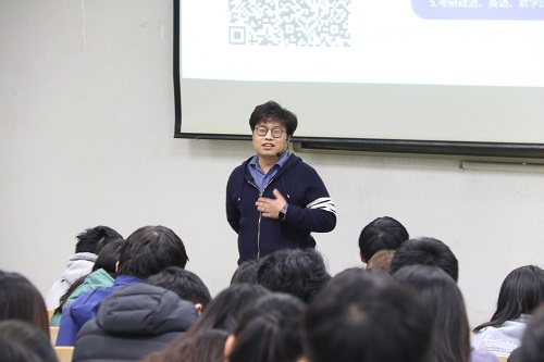 讲座伊始,张崇浩以幽默风趣的开场白,调动同学们的积极性。他指出,随着社会的高速发展,大三学子面临着多种选择:考研、考编、出国深造,并引出本次讲座的重中之重——考研。他将升学规划分为:需求分析、专业定向、择校选择、方案制定、填报指导五个基本流程,并对这五个流程进行扩充分析,逐一讲解。