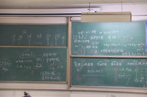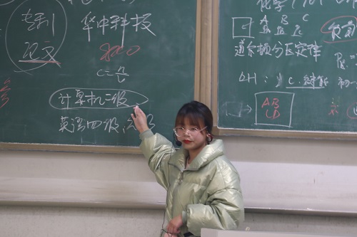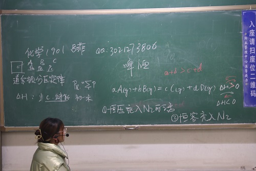 吕菲为学生简单介绍这节课的主要内容。课堂上,她采用交流互动的方法,增加同学们参与课堂学习的积极性,课堂知识氛围浓重。同时,列举道尔顿分压定律、原电池电极电势、化学平衡等难点和重点问题,利用例题,直观地展现知识点的运用,加深印象、强化理解。她认为,在做题的过程中,要将学过的反应一体化、联系化、网络化,弄清其原理,掌握其历程,从而进行深刻的分析,得出结论。