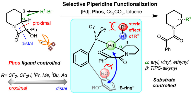 脂肪氮杂环化合物(如哌啶)富含丰富的C(sp3)-H 键,因而利用脂肪氮杂环的C-H键活化以及后期功能化策略来构筑新的含氮化合物在药物化学和材料化学中有着重要的应用前景。近年来,Knochel, Baudoin, Maes, Yu, Glorius, Gong, Sanford等人均在此领域做出了突出的贡献。最近,Sarpong课题组报道了钯/联芳基膦配体催化的哌啶衍生物碳碳键断裂/偶联反应的新进展,相比其他工作,此反应条件更加温和,选择性高,底物兼容性广,因而具有广泛的应用前景。然而此反应的详细机理还不清楚。同时,底物内酰胺碳碳键断裂的选择性(proximal或distal)以及碳碳偶联的区域选择性(α或β)的来源尚不明晰。