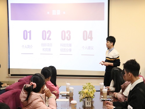 随后,周彤从个人介绍、创新项目、科技竞赛经历分享、个人建议四个方面进行分享。他提到,在实验过程中,应多和项目老师交流,多阅读文献,及时完善,更好的了解项目。他系统地讲解了如何申请专利“SCI”挑战杯国创计划等问题,同时,分享相关网站、微信公众号,帮助同学们更好地了解科技竞赛。周彤讲道:一代人有一代人的使命,当代大学生应积极参加创新训练,积累科研经验,将来为祖国科技创新事业做出贡献,科技报国。