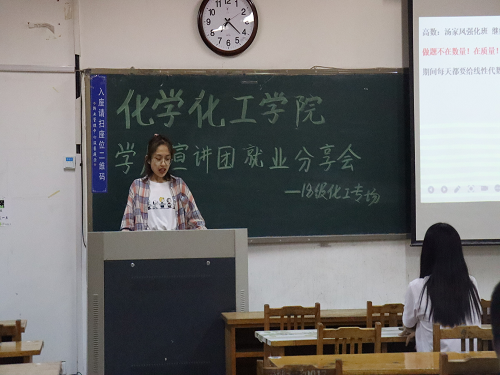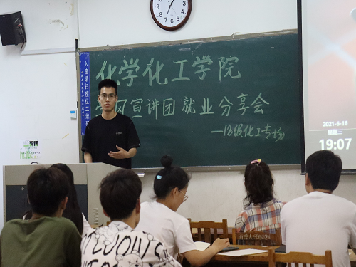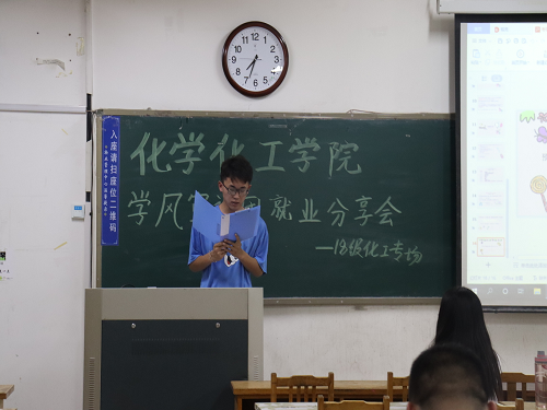 6月16日晚,化学化工学院在13号教学楼401教室举行考研就业分享会,会议由学生会发展就业部志愿者主持。化工1908柳鑫雨和化工1706赵保忠担任主讲人。