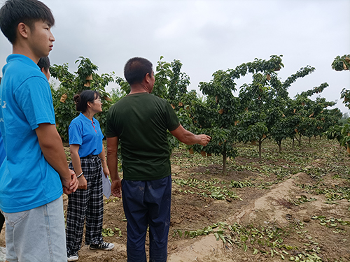 7月18日是实践团来到高青县的第一天,队员们一早便从山东理工大学乘公交车出发,经过一路的颠簸和不停的换车,我们来到了宫王赵村,勤快的赵爷爷也早早的骑着三轮车在村口等待着我们。坐在赵爷爷的电动车上,看天空澄碧,纤云不染,玉米生长的茂盛,碧绿一片仿佛要蔓延到天际,尤为壮观。第一站,实践团按照前期的规划,先后参观了当地的特色种植产业:桃林,帮助农民摘桃袋,参观家庭生态农业区等,村民们细心地向实践团队员讲解摘袋的技巧方法,“把缠在桃子柄上的铁丝绕开,一撕,袋子就拆下来了”在耐心地听完讲解和注意事项后,队员们便埋头干起来,烈日炎炎下,他们汗流浃背,深切体验到了农民耕种的艰辛,也学到了很多知识。赵爷爷还向队员们感叹道:“乡村振兴政策使我们村子发生了很大的变化,刚刚我们走过的水泥路本来是一片荒废了的山坡,因为脱贫攻坚铲平了,是我们拥有了更多的土地……”