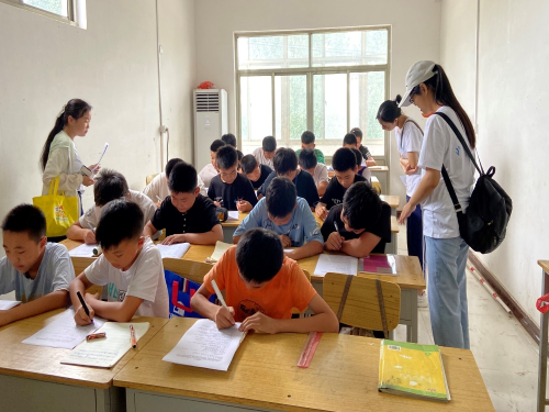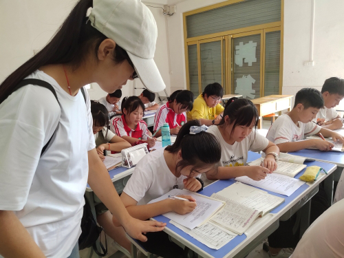 图为晨曦实践团成员在聊城市东昌府区韩集乡暑期课外培训班查看学生问卷完成情况 钟兰兰摄