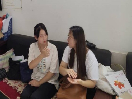 图为晨曦实践团队长在聊城市东昌府区韩集乡暑期课外培训班与助理老师进行交谈 曹梦凡摄