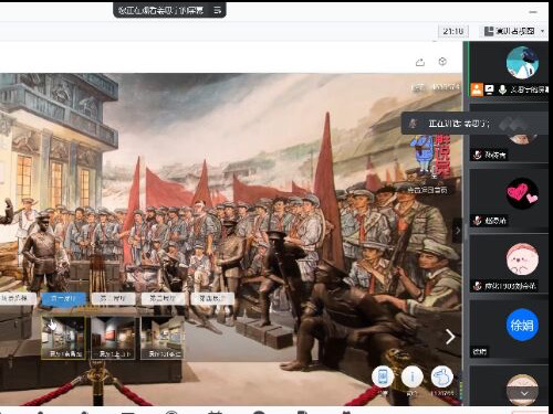 线上对井冈山革命博物馆参观和调研依托3D 参观图景,方便且了解内容丰富。团队依次选择不同的场景,整个场馆分为四个展厅,每个展区又详细地介绍不同的历史事件,每选择参观和了解一个展区,都会有相应的线上解说员向我们介绍和解说这一展区所展示的历史事件,以及所包含的中国伟大的革命精神。另外,团队成员都会在参观展区时发表自己对这一历史事件的情怀和认识,分享自己和相关历史事件之间的小故事,更加深了团队成员对相关历史事件的印象,更有助于团队成员学习中国伟大的革命精神。