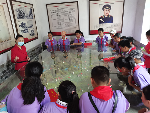 图为讲解员带领实践团成员和小学生参观八路军115师旧址