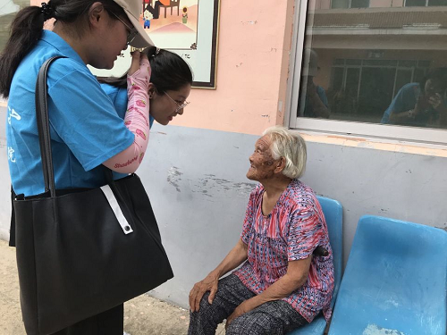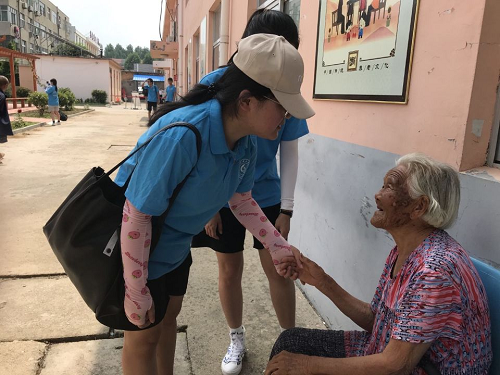 团队到达敬老院的时候,正是天气炎热的时候,简单的说明情况之后,小组成员便顺利的得到许可进入,领导和镇长带着我们参观了敬老院。专门的工作人员把环境整理的很干净,各种设施也是应有尽有。一进门便看到了很多老人在院子里乘凉聊天。老人们一看到顶着炎热天气来看望他们的学生,欢喜之情溢于言表,立刻关心起来,拉着小组成员嘘寒问暖,从哪里来啊、多大了啊、吃饭没有等等,经过了解才知道,由于疫情防控,暂时不允许家属探望,所以老人们对小组成员格外亲切。