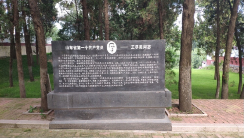 陵园大门面南,正中影壁上题有山东省早期共产党员之一的王尽美的生平传略。里面有大量珍贵历史资料,山东省第一个共产党员王尽美同志的革命事迹颇为感动,为广泛宣传马列主义,教育群众,打击敌人,王尽美同志创办报刊,唤醒无数沉睡的工人,农民和知识分子,投入到革命洪流,繁重的工作和艰苦生活,使他积劳成疾,年仅二十七岁。