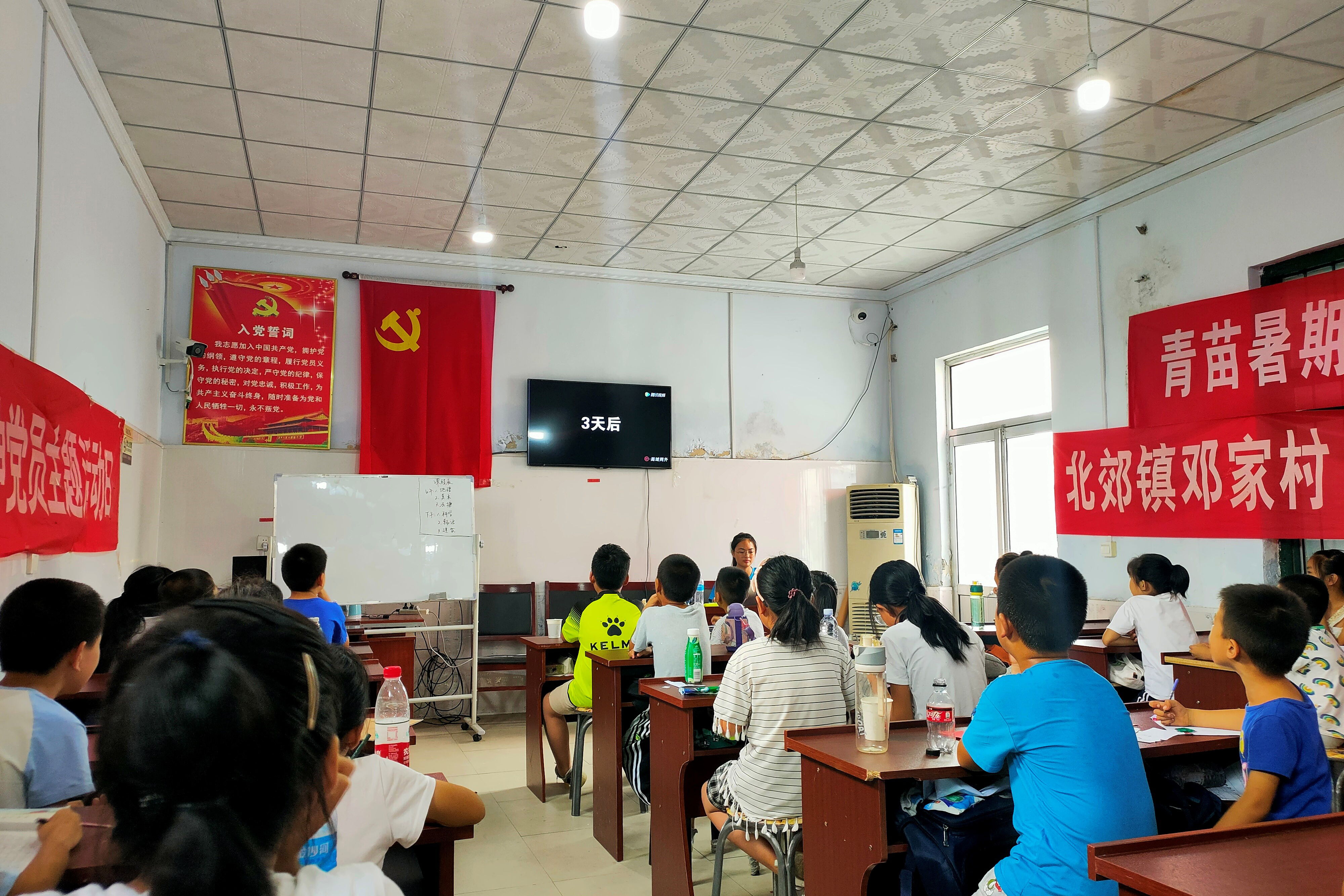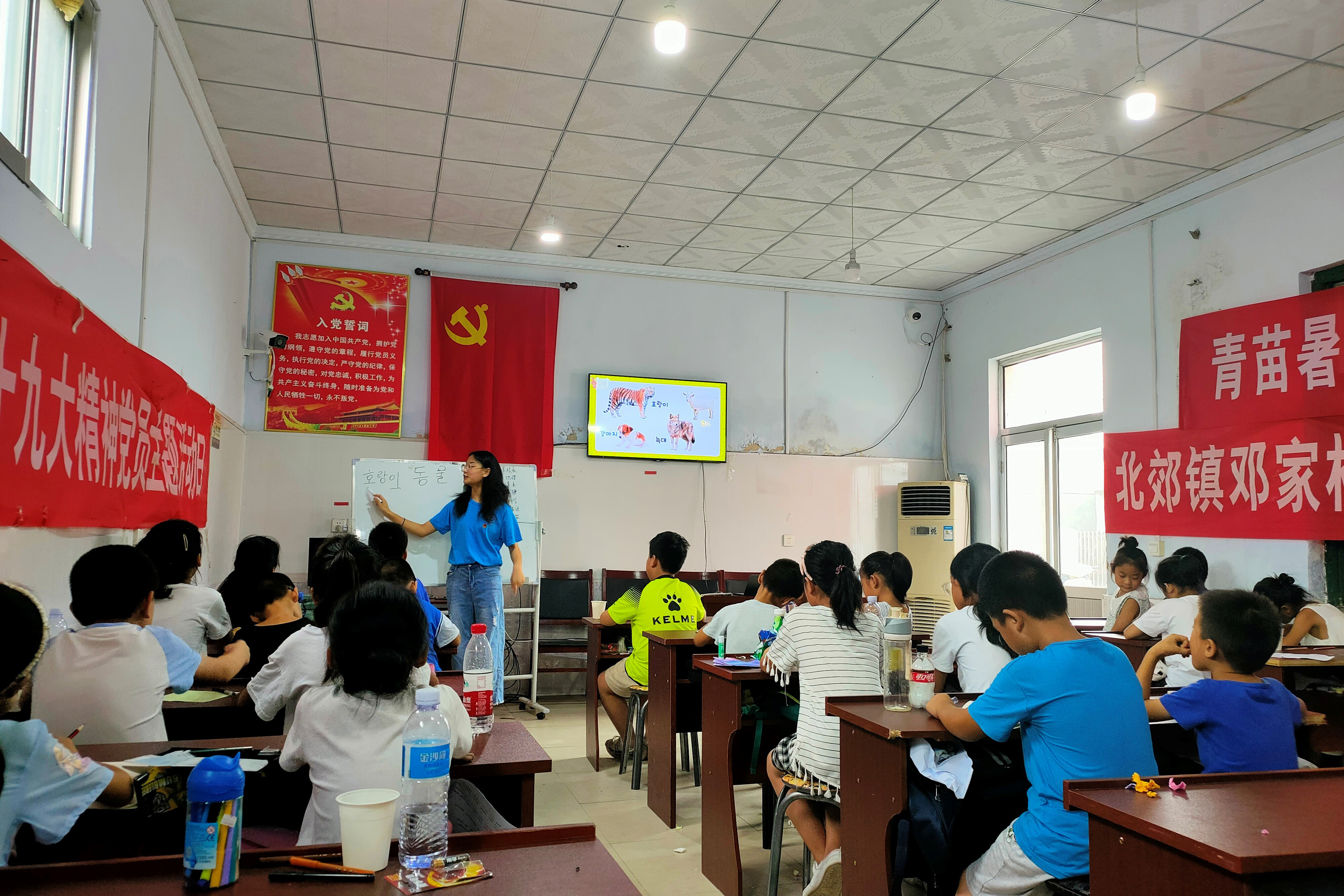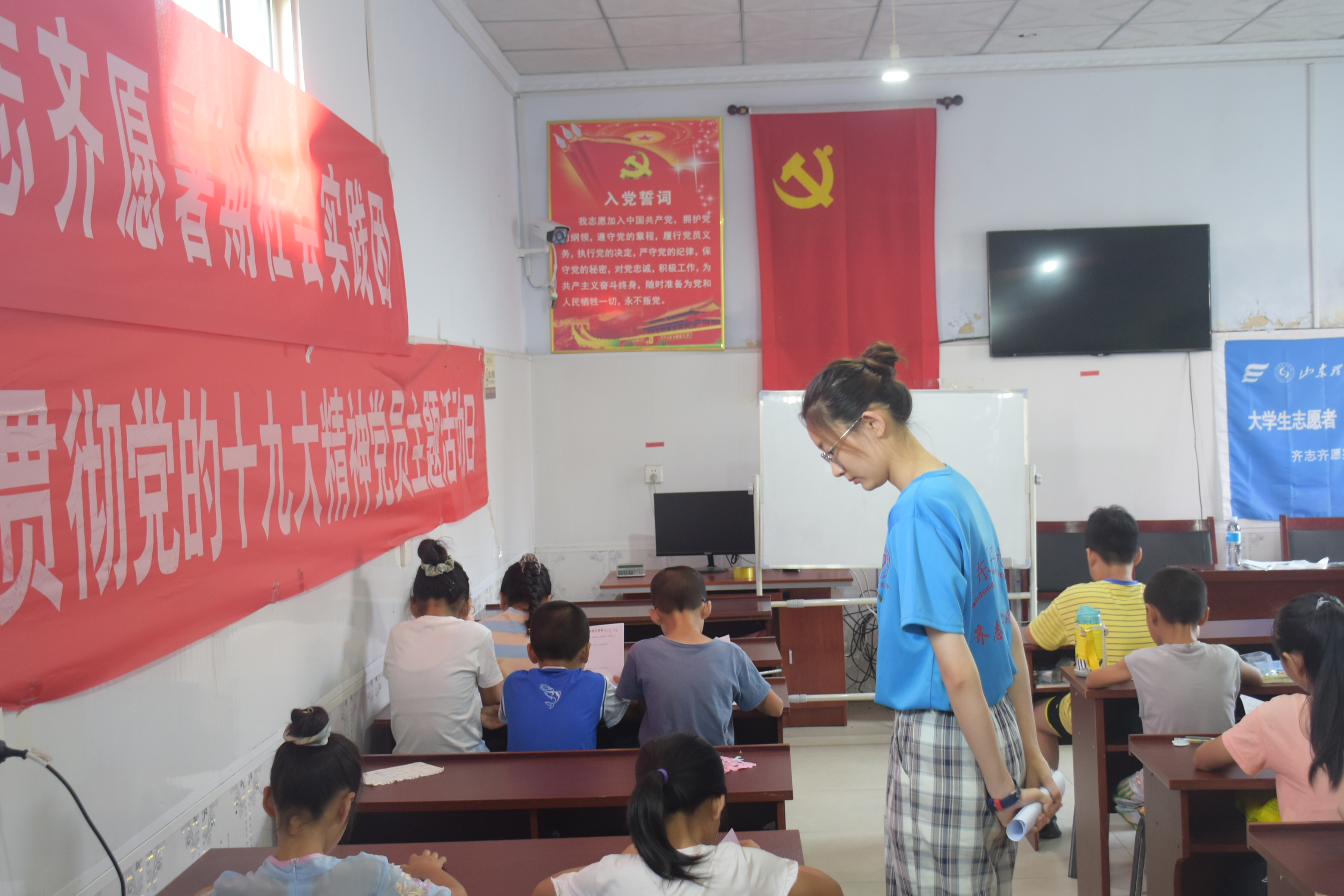 为了让留守儿童在暑假能够接受教育,实践团成员能够在实践中锻炼自己,山东理工大学青年志愿者协会“齐志齐愿”实践团青苗实践队队员在邓家村村委教室进行支教活动。