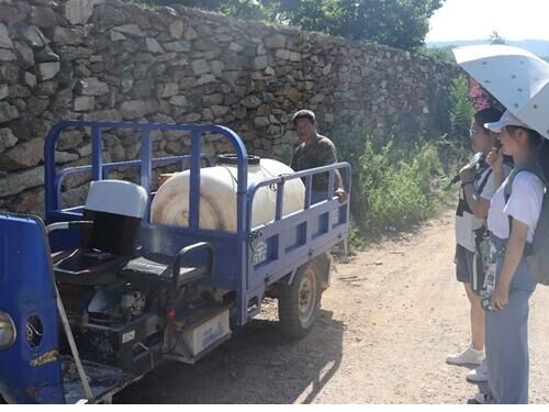 随后,整顿出发前往山东省栖霞市李博士夼村,村中实行有林长制林长为于宝贵,河长制河长为于杰。并集体前往李博士夼大水库,水库生态环境良好,水质清晰,并有天鹅等动物栖息。但由于夏季降水较少,并需要引水库水灌溉农田,所以水库水量较少。随后沿途下山,团队成员看到了有许多村民进行果园的浇水和喷药工作,并在过程中看到了村民使用的劳动工具。村民借用水桶去水库抽水,从而方便灌溉林田。还有喷洒农药的背箱,由于李博士夼村大多数林田位于山上,所以并未实现大规模的机械化生产,多用人工进行种植培养。